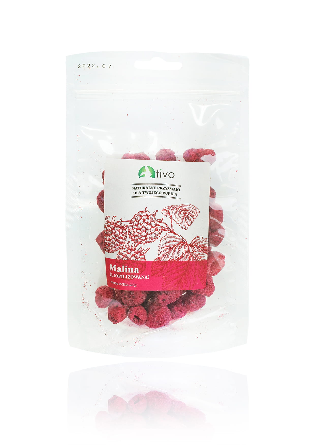 Malina liofilizowana. Bez cukru, bez konserwantów, bez sztucznych barwników. Naturalny smak, aromat i kolor. Maliny zawierają wiele witamin, takich jak witamina C, E, B1, B2, B6 oraz magnez, wapń, potas i żelazo. Dodatkowo króliki uwielbiają ich smak.